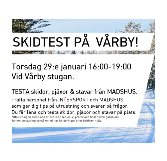 På torsdag den 29 januari gästas Vårby Arena av Madshus och Intersport. Det kommer finnas möjlighet att prova såväl skidor som pjäxor för dig som